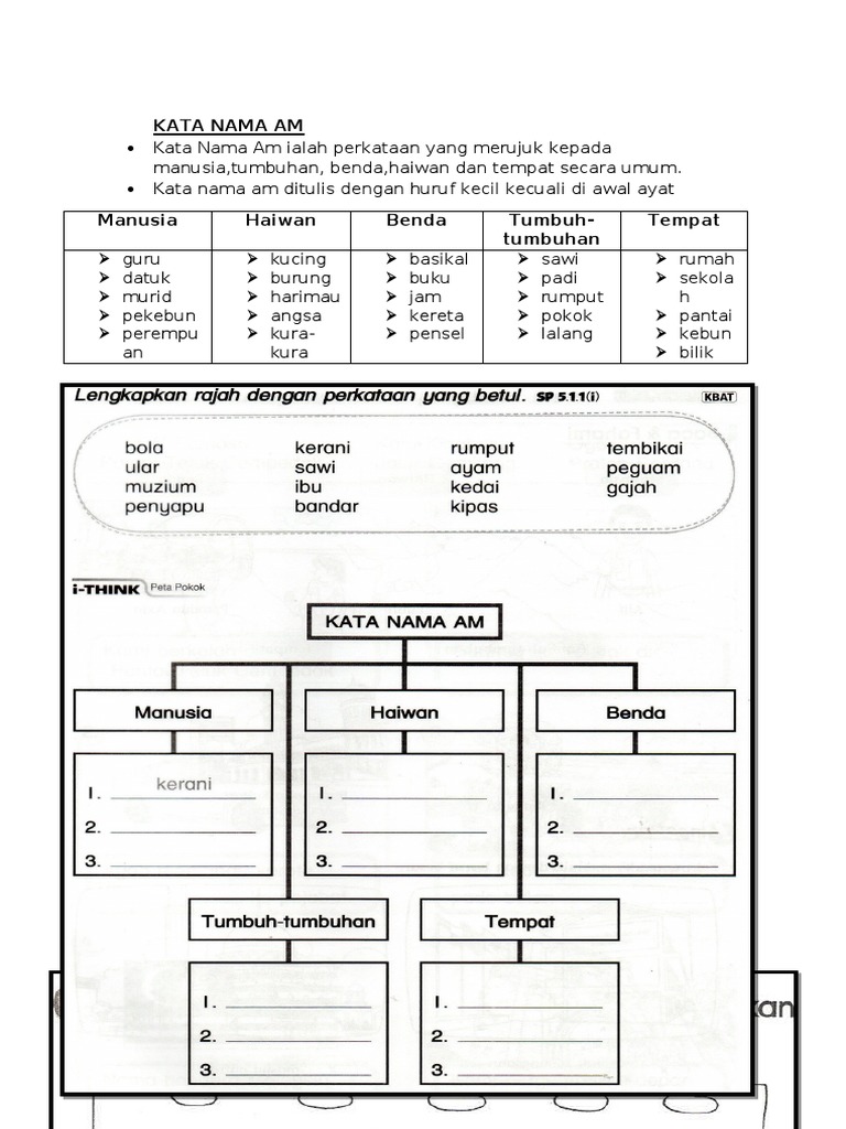 I kata nama am ii kata nama khas Senaraikan kata nama am dan kata nama khas berdasarkan teks dan gambar dengan menggunakan peta pokok. Peta Pemikiran 8 Bahagian 3. 1 Kata nama am digunakan untuk menamakan sesuatu benda orang binatang dan tempat secara umum.